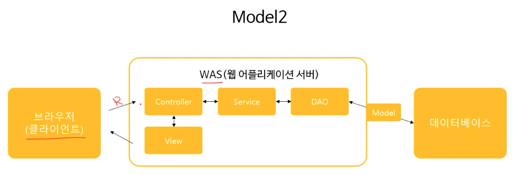 => Model 1 과 달리 컨트롤러, 서비스, DB, VIEW 등으로 각각을 모듈화 시킴