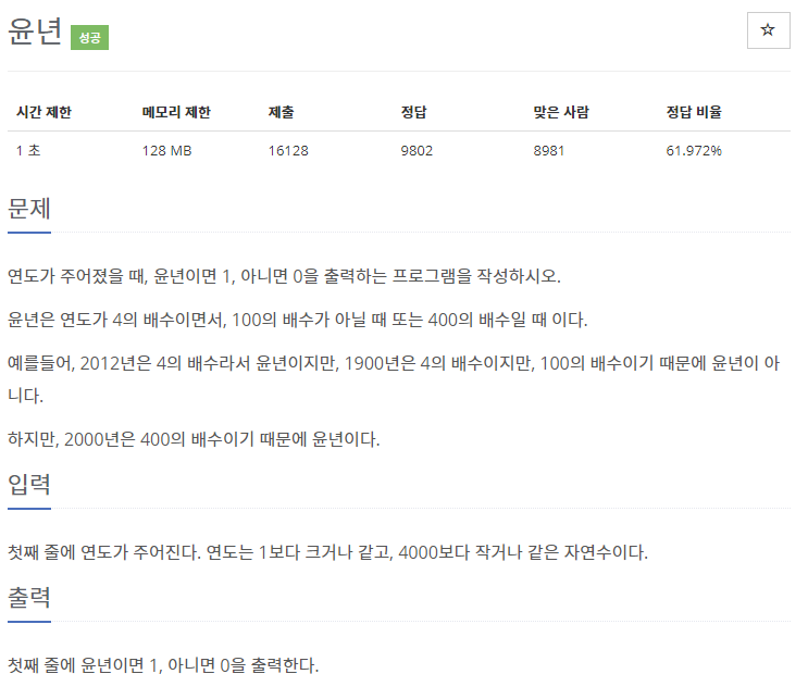 #include <iostream> using namespace std; int main() { int year; cin >> year; if (year % 4 == 0) { if (year % 100 != 0) cout << 1; else if (year % 400 == 0) cout << 1; else cout << 0; } else cout << 0; return 0; }반응형'백준 algorithm' 카테고리의 다른 글