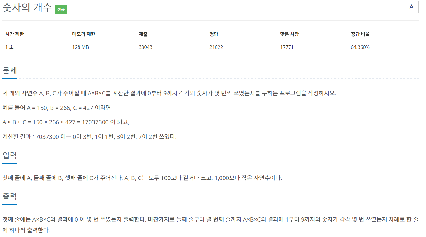 #include <iostream> #include <algorithm> #include <vector> using namespace std; int main() { int bae[10] = { 0 }; int a, b, c = 0; cin >> a >> b >> c; int sum = a * b*c; int sum2 = sum; int count = 0; while (sum2 > 0) // 숫자의 길이 알아내기 위함 { sum2 = int(sum2 / 10); count++; } for (int i = 0; i < count; i++) //각 자리 숫자를 하나씩 빼내어 확인하기 { int index; index = sum % 10; bae[index]++; sum = sum / 10; } for (int j = 0; j < 10; j++) { cout << bae[j] << endl; } }반응형'백준 algorithm' 카테고리의 다른 글