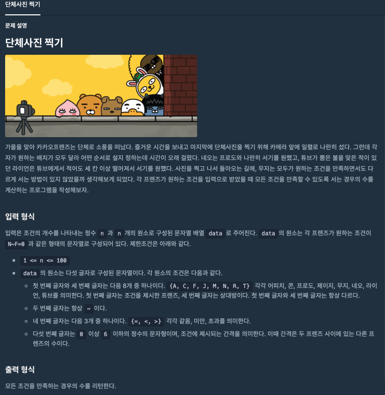 #include <string> #include <vector> #include <algorithm> #include <iostream> using namespace std; // 전역 변수를 정의할 경우 함수 내에 초기화 코드를 꼭 작성해주세요. int solution(int n, vector<string> data) { int answer = 0; string kakao ="ACFJMNRT"; do{ bool flag = true; for(int i=0; i<n; i++)//제한사항 갯수 { char first = data[i][0]; char second = data[i][2]; char compare = data[i][3]; int amount = data[i][4]-'0'; int tmp = kakao.find(second)-kakao.find(first); int distance = abs(tmp) - 1; if(compare == '=')//붙어있는 경우 { if(distance == amount)flag = true; else flag = false; } else if(compare == '<') { if(distance < amount)flag = true; else flag = false; } else if(compare == '>') { if(distance > amount)flag = true; else flag = false; } if(flag)continue; else { flag = false; break; } } if(flag)answer++; }while(next_permutation(kakao.begin(), kakao.end())); return answer; }=> 사진을 찍을 수 있는 경우의 수는 '순열'의 개수입니다.