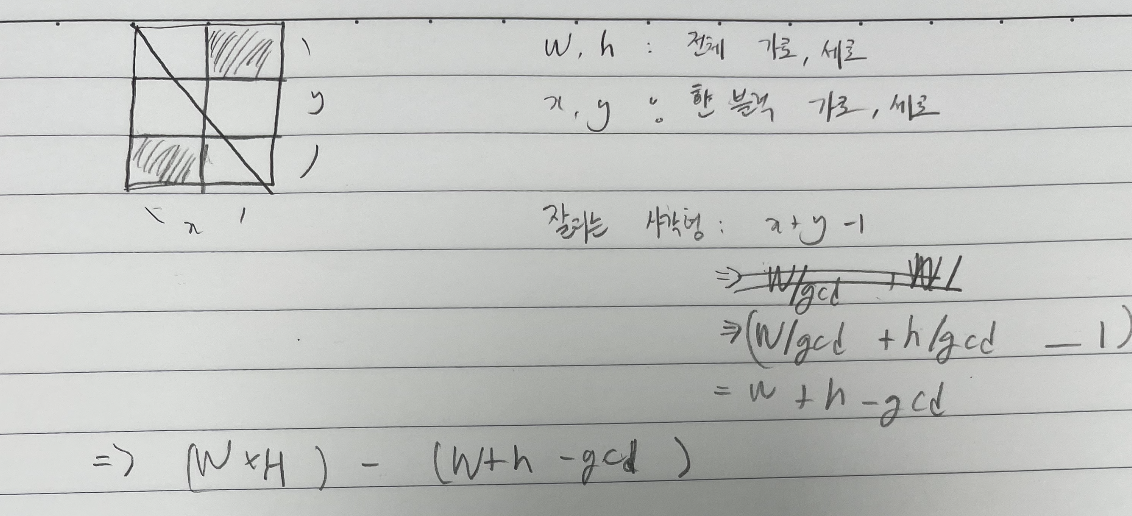 => 작은사각형무리에서 지워지는 사각형의 갯수는 X+Y-1입니다. (X:W를 최대공약수로 나눈수 Y:H를 최대공약수로 나눈수)