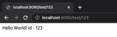 package com.example.demo.controller; import org.springframework.web.bind.annotation.PathVariable; import org.springframework.web.bind.annotation.GetMapping; import org.springframework.web.bind.annotation.RequestMapping; import org.springframework.web.bind.annotation.RestController; @RestController @RequestMapping("test") //resource public class TestController { @GetMapping("/{id}") public String testControllerWithPathVariables(@PathVariable(required = false) int id) { return "Hello World! id : " +id; } }=> required가 false이므로 굳이 값을 쓰지 않아도 정상적으로 출력됩니다. (물론 id의 값은 안나오겠지만요)