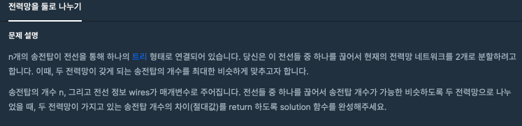 - 전력망 네트워크가 하나의 트리 형태가 아닌 경우는 입력으로 주어지지 않습니다.