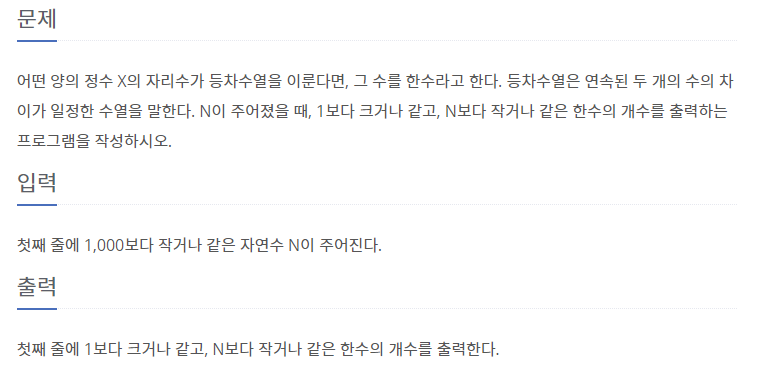 위의 방법으로 분열한 숫자들을 배열속에 넣고 연속하는 배열의 수들의 크기 차이가 동등한지 확인하여 카운트 갯수를 늘린다.#include <iostream> using namespace std; int method(int number) { int DP[3] = { 0 }; int value = 99; if (number <= 99) { value = number; } else if (99 < number) { for (int i = 100; i <= number; i++) { DP[0] = i / 100; //100의자리숫자 DP[1] = (i / 10) % 10;//10의자리숫자 DP[2] = i % 10;//1의자리숫자 if ((DP[0] - DP[1]) == (DP[1] - DP[2])) { value++;//값 증가 } } } return value; } int main() { int han;//1000보다 작거나 같은 자연수 N //0~99까지는 모두가 한수이다. cin >> han; cout << method(han); return 0; }