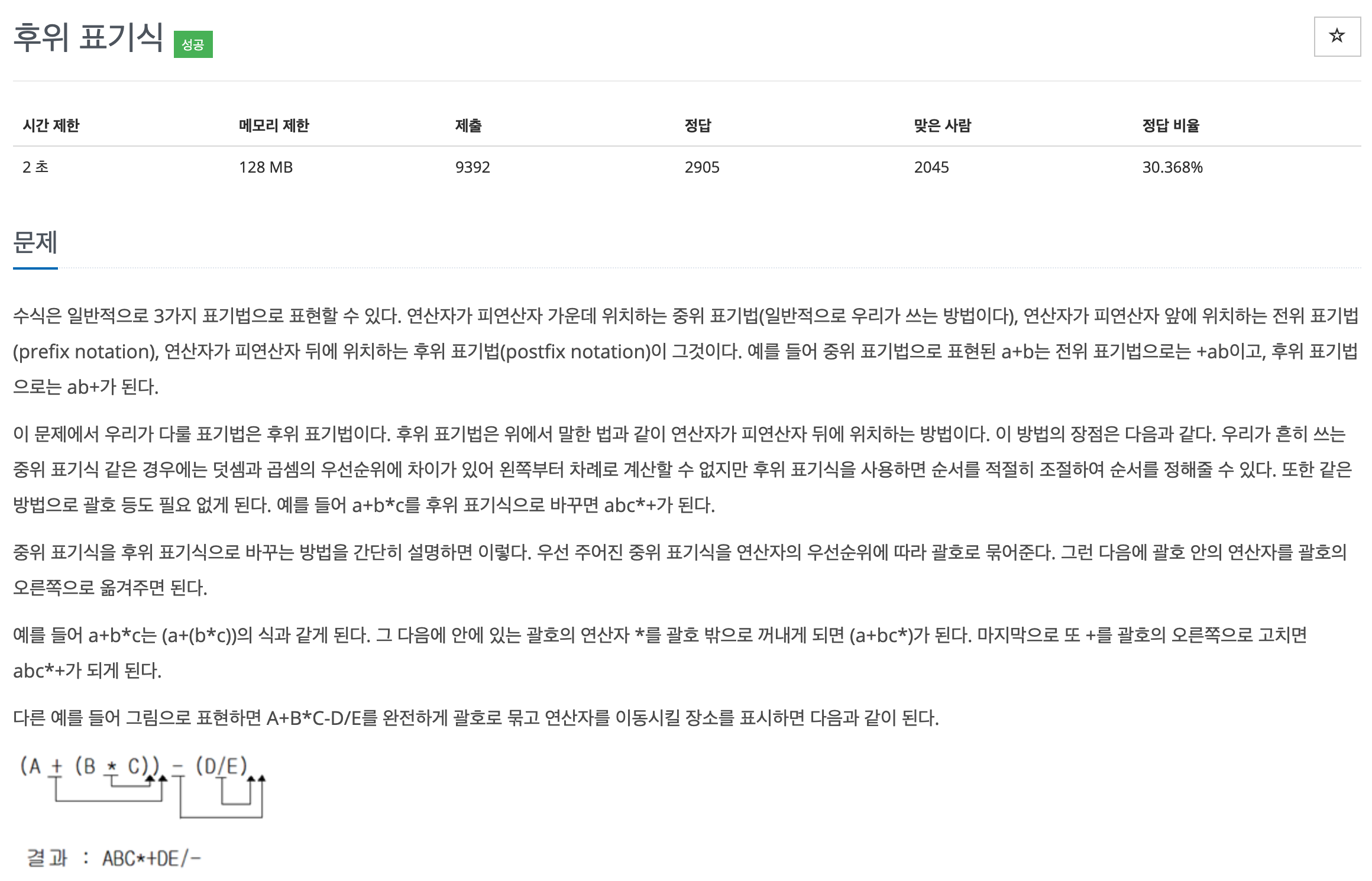 후위표기식2 와 달리 계산하는 것이 아닌 중위표기식을 후위표기식으로 바꾸는 방법이다.