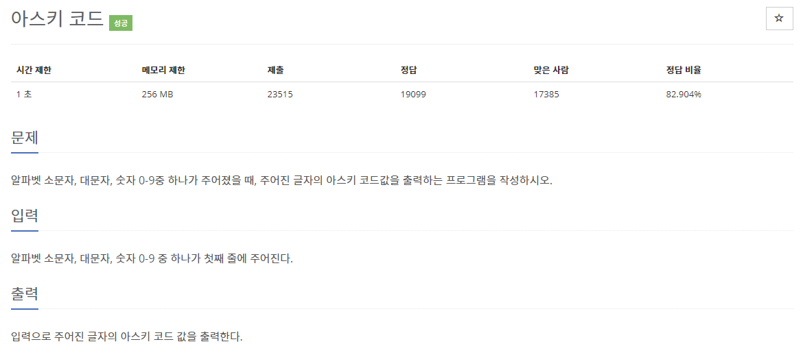 #include <iostream> using namespace std; int main() { char ch=0; cin >> ch; cout << (int)ch; return 0; }반응형'백준 algorithm' 카테고리의 다른 글