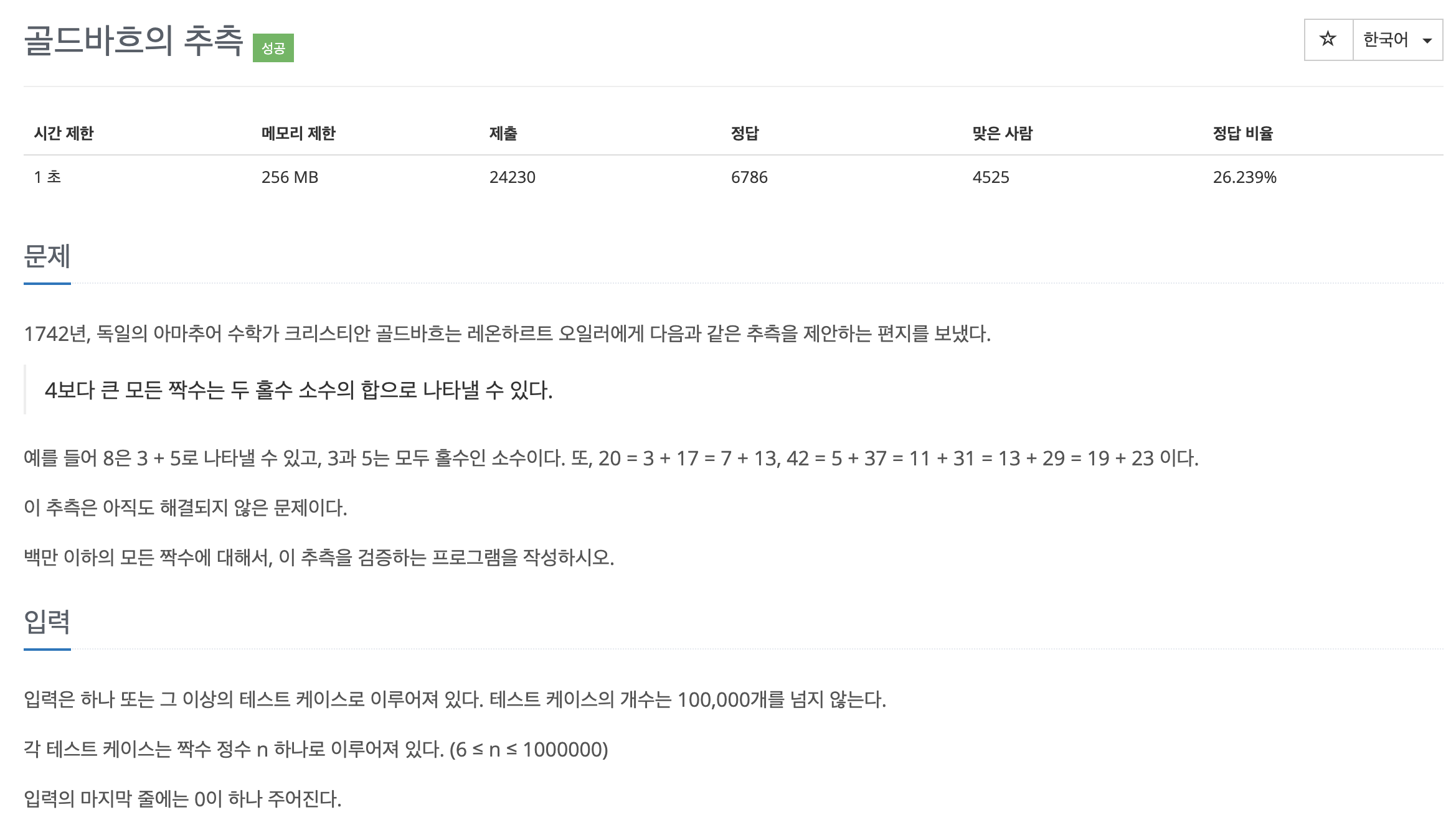 해당 방법이 본인이 푼 방법보다 훨씬 빠르게 풀 수 있는 방법이다.#include <iostream> #include <string> #include <algorithm> #include <vector> #include <utility> using namespace std; vector<int> prime; bool check[1000001]; int answer[2]={-1}; void find(int A) { int IndexLimit=0; while(prime[IndexLimit]<=A) { ++IndexLimit; } for(int i=0; i<=IndexLimit; ++i) { for(int j=0; j<=IndexLimit; ++j) { if(prime[i] + prime[j] == A) { answer[0]=i; answer[1]=j; return; } else if(prime[i] +prime[j] >A) { break; } } } } int main() { ios_base::sync_with_stdio(false); cin.tie(nullptr); cout.tie(nullptr); for(long i=2; i<=1000000; ++i) //eratosthenes { if(check[i] == false) { prime.push_back(i); for(long long j=i*i; j<=1000000; j+=i) { check[j]=true; } } } int B; while(1) { cin>>B; if(B==0)break; else{ find(B); if(answer[0] == -1)cout <<"Goldbach's conjecture is wrong."<<'\n'; else{ cout << B <<" = "<<prime[answer[0]]<<" + "<<prime[answer[1]]<<'\n'; answer[0]=-1;answer[1]=-1; } } } return 0; }반응형'백준 algorithm' 카테고리의 다른 글