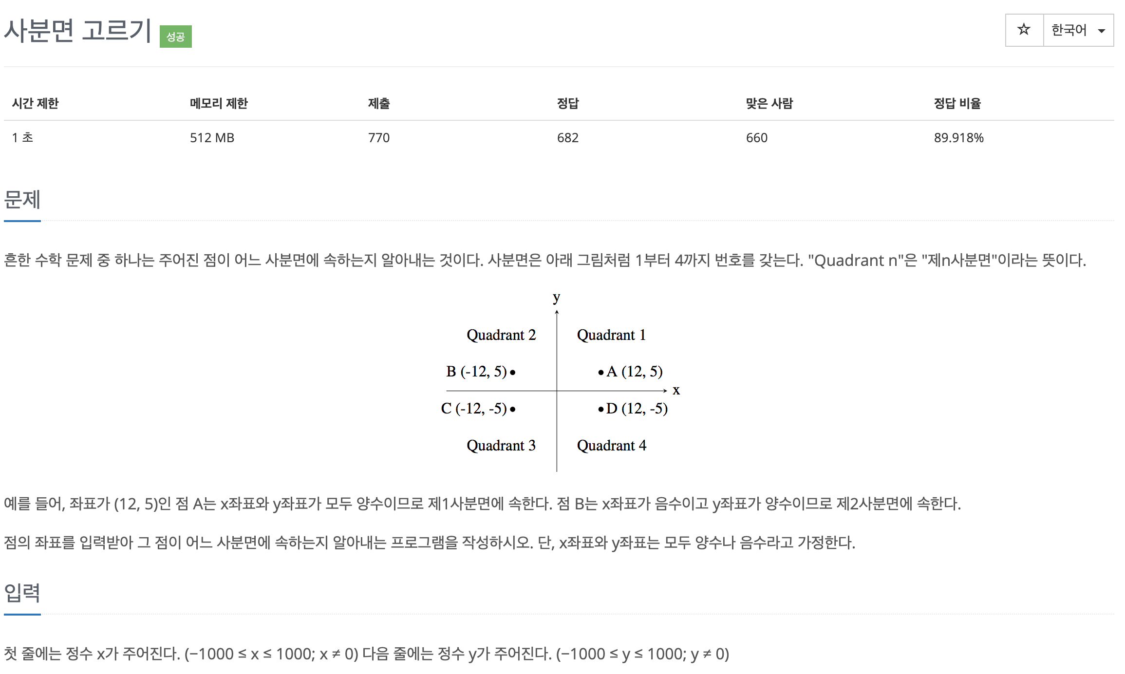 문제 설명 #include <iostream> using namespace std; int main() { ios_base::sync_with_stdio(false); cin.tie(nullptr); cout.tie(nullptr); int X, Y; cin >> X >> Y; if(X>0 && Y>0)cout <<1; else if(X<0 && Y>0)cout<<2; else if(X<0 && Y<0) cout <<3; else if(X>0 && Y<0 ) cout <<4; return 0; }반응형'백준 algorithm' 카테고리의 다른 글