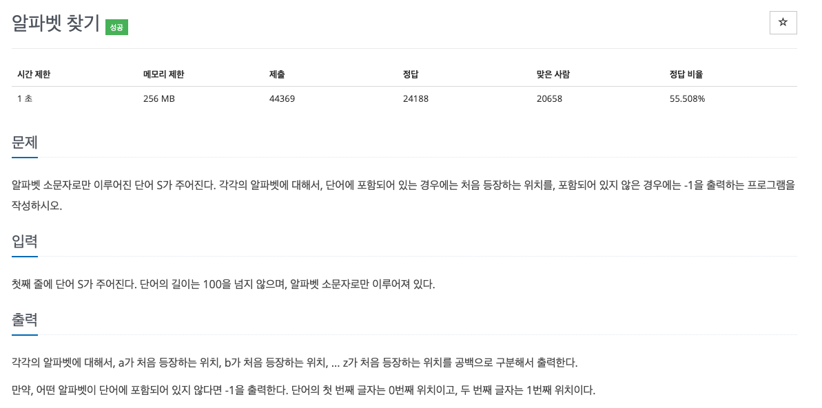 int arr[26]; fill_n(arr, 26, -1);#include <iostream> #include <string> #include <algorithm> using namespace std; int main() { ios_base::sync_with_stdio(false); cin.tie(nullptr); cout.tie(nullptr); //int arr[26]={[0 ... 25]=-1}; int arr[26]; fill_n(arr, 26, -1); string S; cin >> S; int len = S.length(); for(int i=0; i<len ; i++) { int tmp = S[i]-'a'; if(arr[tmp] == -1) { arr[tmp]=i; } } for(int i=0; i< 26; i++) { cout << arr[i]<<" "; } cout <<'\n'; return 0; }반응형'백준 algorithm' 카테고리의 다른 글