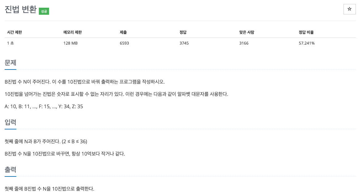 문제 설명 => 진법 변환 2와 달리 B 진법으로 표시되어 있는 수를 10진법으로 변환하면 되는 문제이다.