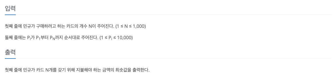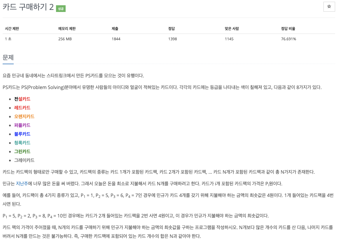 => DP 문제입니다. => 카드 i개를 구매할 때의 최대 비용을 생각해야 합니다. => D[i] : 카드 i개 구매하는 최대 비용 =>카드 i개를 구매하는 방법의 가짓수 카드 1개 들어있는 카드팩 구매, 카드 i - 1개 구매..