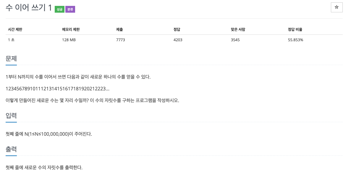 #include <iostream> #include <algorithm> #include <string> using namespace std; int main() { ios_base::sync_with_stdio(false); cin.tie(nullptr); cout.tie(nullptr); int N; cin >> N; int ans=0; for(int i=1; i<=N; i++) { string str = to_string(i); int len = str.length(); ans += len; } cout << ans<<'\n'; }=>위와 같은 방법이 아닌 계산으로 더하는 방법을 고안해내야합니다.