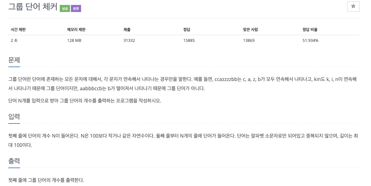 #include <iostream> #include <algorithm> #include <string> int arr[10]; using namespace std; bool alphabet[27]; void reset() { for(int i=0; i<27; i++) { alphabet[i]=false; } } int main() { ios_base::sync_with_stdio(false); cin.tie(nullptr); cout.tie(nullptr); int N; cin >> N; string arr[101]; string str; for(int i=0; i< N; i++) { cin >> str; arr[i] = str; } int cnt =0; bool okay; for(int i=0; i<N; i++) { string tmp = arr[i]; int len = tmp.length(); for(int j=0; j<len; j++) { if(!alphabet[tmp[j]-97]) // 한번도 나오지 않은 경우 { alphabet[tmp[j]-97]=true; // 나온것 확인 } else //나왔던 알파벳인 경우 { if(tmp[j] ==tmp[j-1] )//이전것이 연속인 경우 { continue; } else//이전것과 다른 경우 { okay = true; // 집합의 단어가 아님 break; } } } if(okay != true) //적합한 단어라면 { cnt++; okay =false; } reset(); okay = false; } cout << cnt <<'\n'; return 0; }