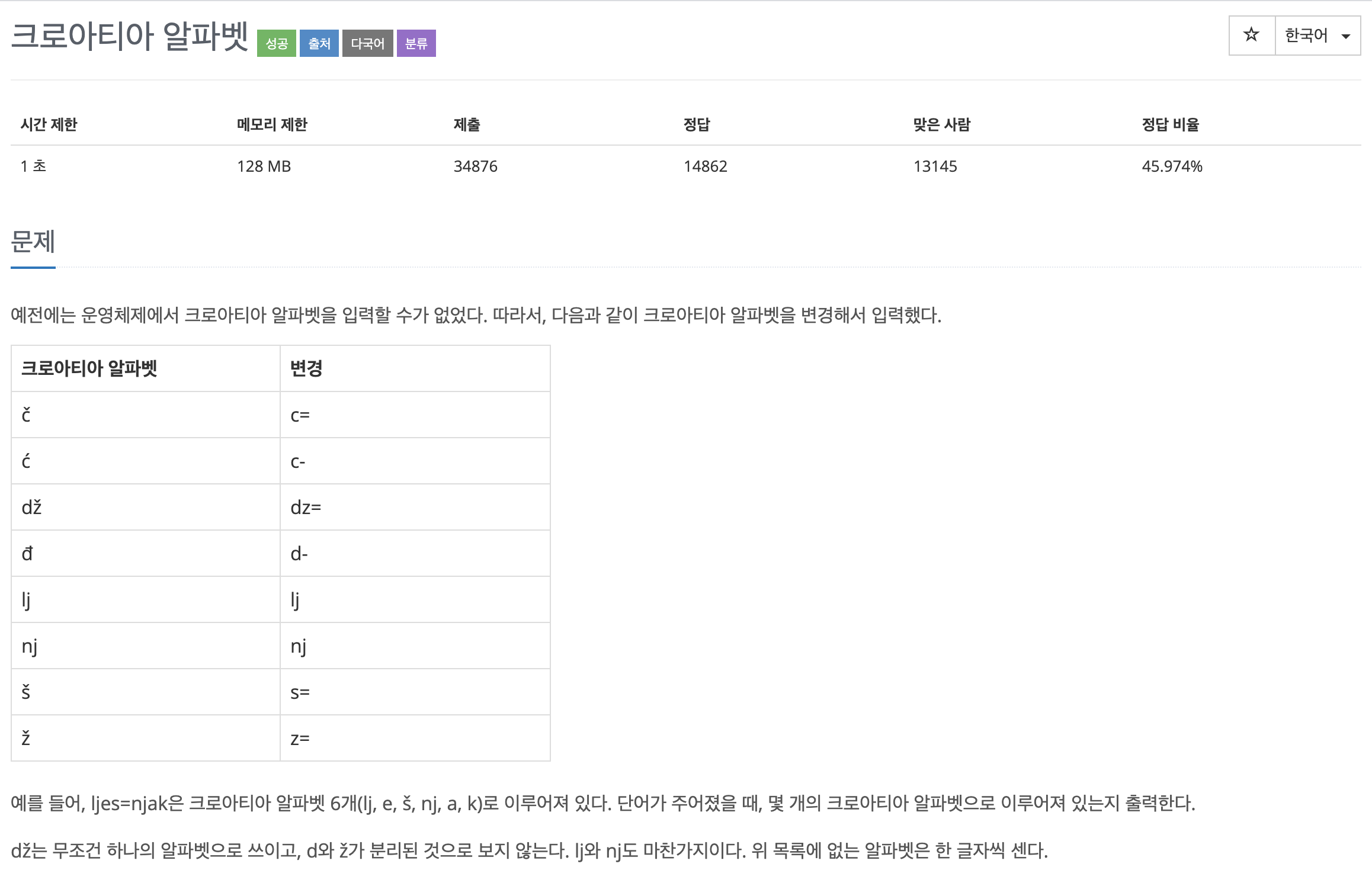 해당 과정을 진행하며, 크로아티아 알파벳의 개수와 해당 알파벳의 길이를 점진적으로 구한다.