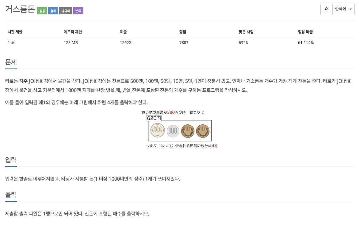 #include <iostream> #include <algorithm> using namespace std; int main() { ios_base::sync_with_stdio(false); cin.tie(nullptr); cout.tie(nullptr); int yen[6]={500,100,50,10,5,1}; int pay; cin >> pay; pay = 1000-pay; int cnt=0; for(int i=0; i<6; i++) { int tmp = pay / yen[i]; if(tmp > 0) { pay %= yen[i]; cnt += tmp; } } cout <<cnt <<'\n'; return 0; }