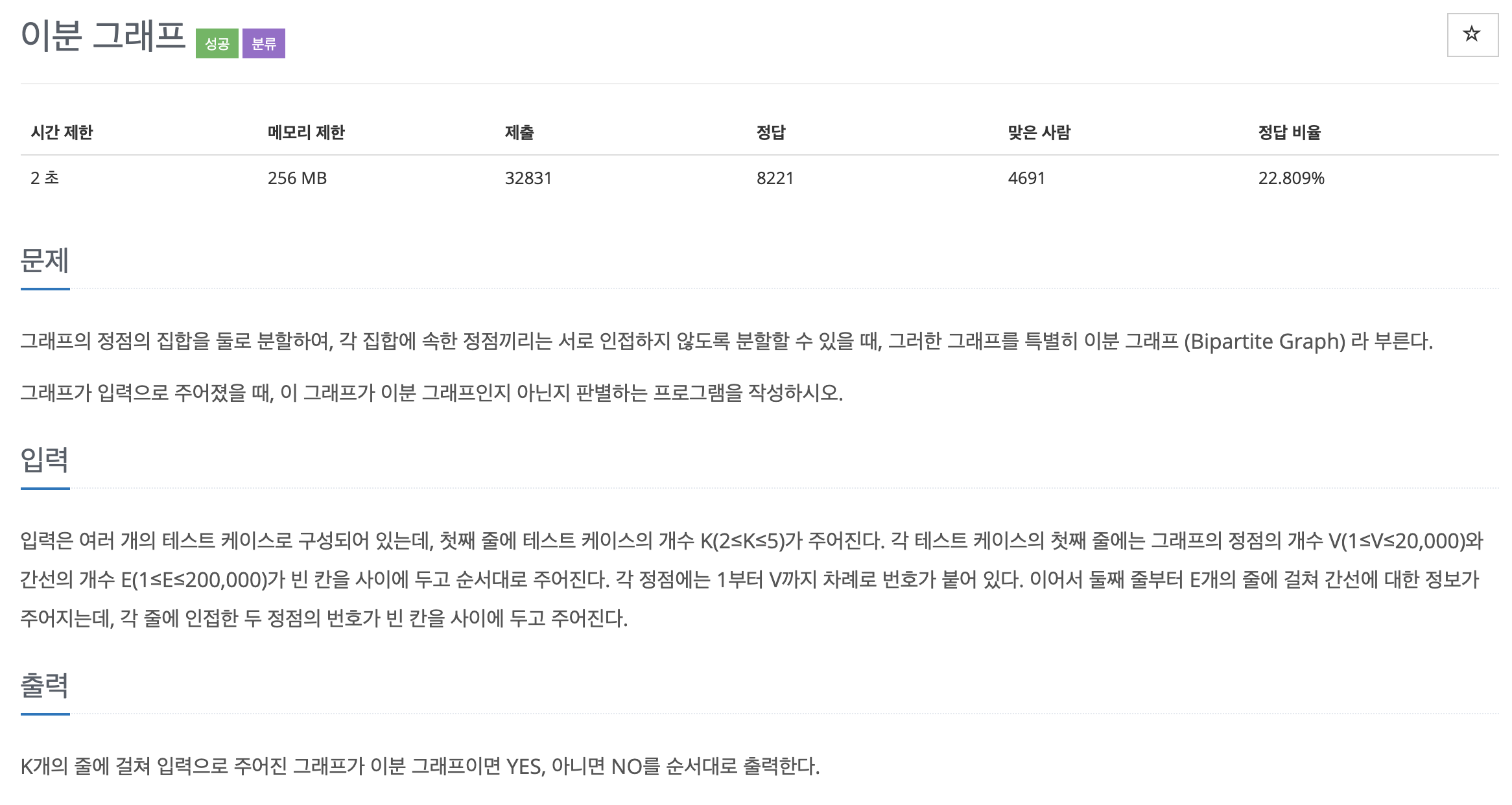 #include <iostream> #include <algorithm> #include <string> #include <vector> #include <queue> using namespace std; vector<int> a[20001]; int color[20001]; bool dfs(int node, int c) { color[node] = c; for(int i=0; i<a[node].size(); i++) { int next= a[node][i]; if(color[next] == 0) { if(dfs(next, 3-c) == false) { return false; } } else if (color[next] == color[node]) { return false; } } return true; } int main() { ios_base::sync_with_stdio(false); cin.tie(nullptr); cout.tie(nullptr); int t; cin >> t; while(t>0) { int n,m; cin >> n>> m; for(int i=1; i<=n; i++) { a[i].clear(); color[i] = 0; } for(int i=0; i<m; i++) { int u,v; cin >> u >>v; a[u].push_back(v); a[v].push_back(u); } bool ok = true; for(int i=1; i<=n; i++) { if(color[i] == 0) { if(dfs(i, 1) == false) { ok = false; } } } if(ok) { cout<< "YES\n"; } else{ cout <<"NO\n"; } t--; } return 0; }반응형'백준 algorithm' 카테고리의 다른 글
