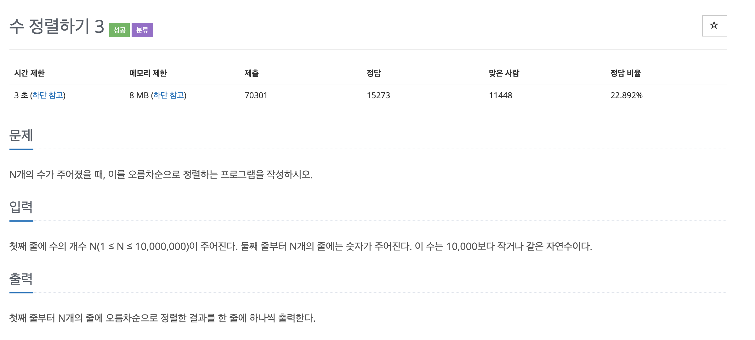 => vector에 넣어 sort 함수를 사용할 경우 시간제한과 메모리 제한에 걸리게 됩니다.