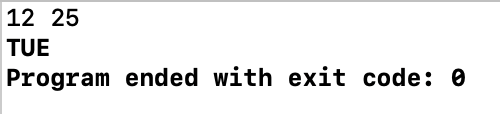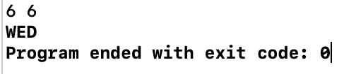 #include <iostream> #include <algorithm> #include <string> using namespace std; string week[7]={"SUN", "MON", "TUE", "WED", "THU", "FRI", "SAT"}; int main() { ios_base::sync_with_stdio(false); cin.tie(nullptr); cout.tie(nullptr); int X, Y; cin >> X >> Y; int index =0; //요일 가리킬 index, 1월 1일은 월요일 for(int i=1; i<=X; i++) { switch(i) { case 1: case 3: case 5: case 7: case 8: case 10: { if(i!= X) { for(int j=0; j<31; j++) { if(index+1 >6) { index = (index+1)%7; } else{ index++; } } } else{ for(int j=0; j<Y; j++) { if(index+1 >6) { index = (index+1)%7; } else{ index++; } } } } break; case 2: { if(i!= X) { for(int j=0; j<28; j++) { if(index+1 >6) { index = (index+1)%7; } else{ index++; } } } else{ for(int j=0; j<Y; j++) { if(index+1 >6) { index = (index+1)%7; } else{ index++; } } } } break; case 4 : case 6 : case 9 : case 11: case 12: { if(i!= X) { for(int j=0; j<30; j++) { if(index+1 >6) { index = (index+1)%7; } else{ index++; } } } else{ for(int j=0; j<Y; j++) { if(index+1 >6) { index = (index+1)%7; } else{ index++; } } } break; } } } cout<<week[index]<<'\n'; return 0; }