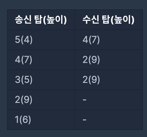 예를 들어 높이가 6, 9, 5, 7, 4인 다섯 탑이 왼쪽으로 동시에 레이저 신호를 발사합니다. 그러면, 탑은 다음과 같이 신호를 주고받습니다. 높이가 4인 다섯 번째 탑에서 발사한 신호는 높이가 7인 네 번째 탑이 수신하고, 높이가 7인 네 번째 탑의 신호는 높이가 9인 두 번째 탑이, 높이가 5인 세 번째 탑의 신호도 높이가 9인 두 번째 탑이 수신합니다. 높이가 9인 두 번째 탑과 높이가 6인 첫 번째 탑이 보낸 레이저 신호는 어떤 탑에서도 수신할 수 없습니다.
