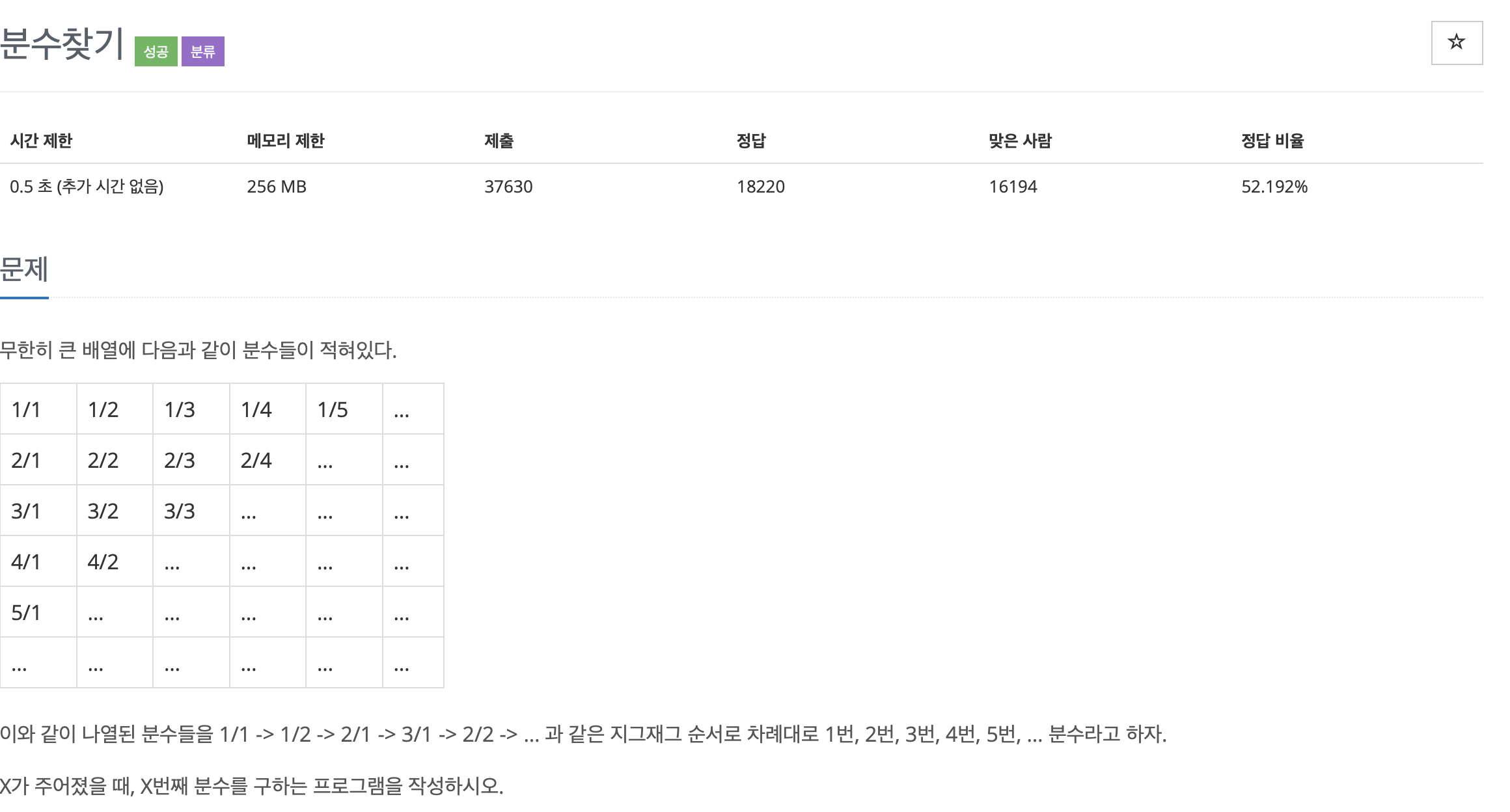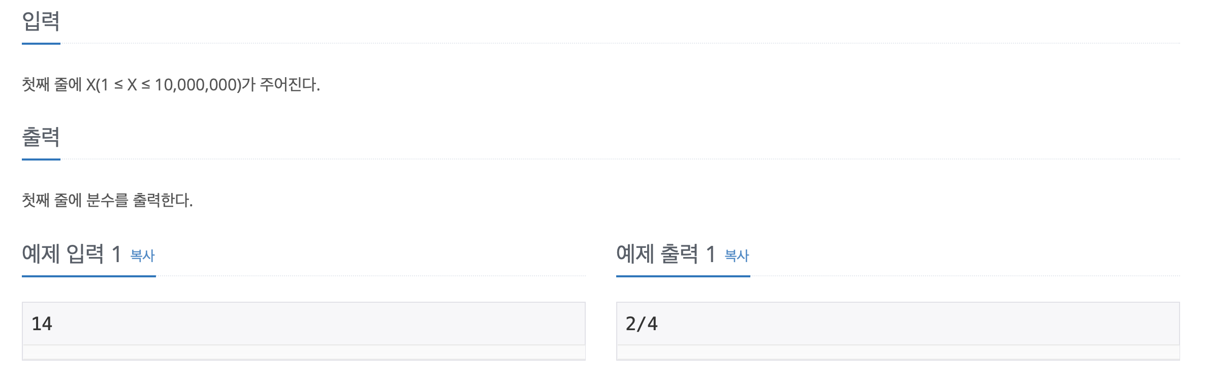 규칙을 찾기 위해 써본 노트 #include <iostream> #include <algorithm> using namespace std; void Print(int deno, int nume) { cout<<nume<<'/'<<deno<<'\n'; } int main() { ios_base::sync_with_stdio(false); cin.tie(nullptr); cout.tie(nullptr); int deno, nume;//분모, 분자 변수 설정 deno = 1; nume = 1; int x; cin >> x; if(x == 1) // 첫번째인 경우 { Print(deno, nume); } else// 순서를 찾아야하는 경우 { deno++; //분모 2로 설정 int line = 2; //줄 횟수 int minus =2; while(1) { if(x - (minus+1) >0) //더아래로 내려갈수 있는 경우 { x -= minus++; line++; } else //줄이 해당 줄인 경우 { break; } } //cout << line ; if(line % 2 == 0) //짝수행일때 { deno =line - (x-2); nume =(line+1) - deno; Print(deno, nume); } else//홀수행일때 { nume =line - (x-2); deno = (line+1) - nume; Print(deno, nume); } } return 0; }