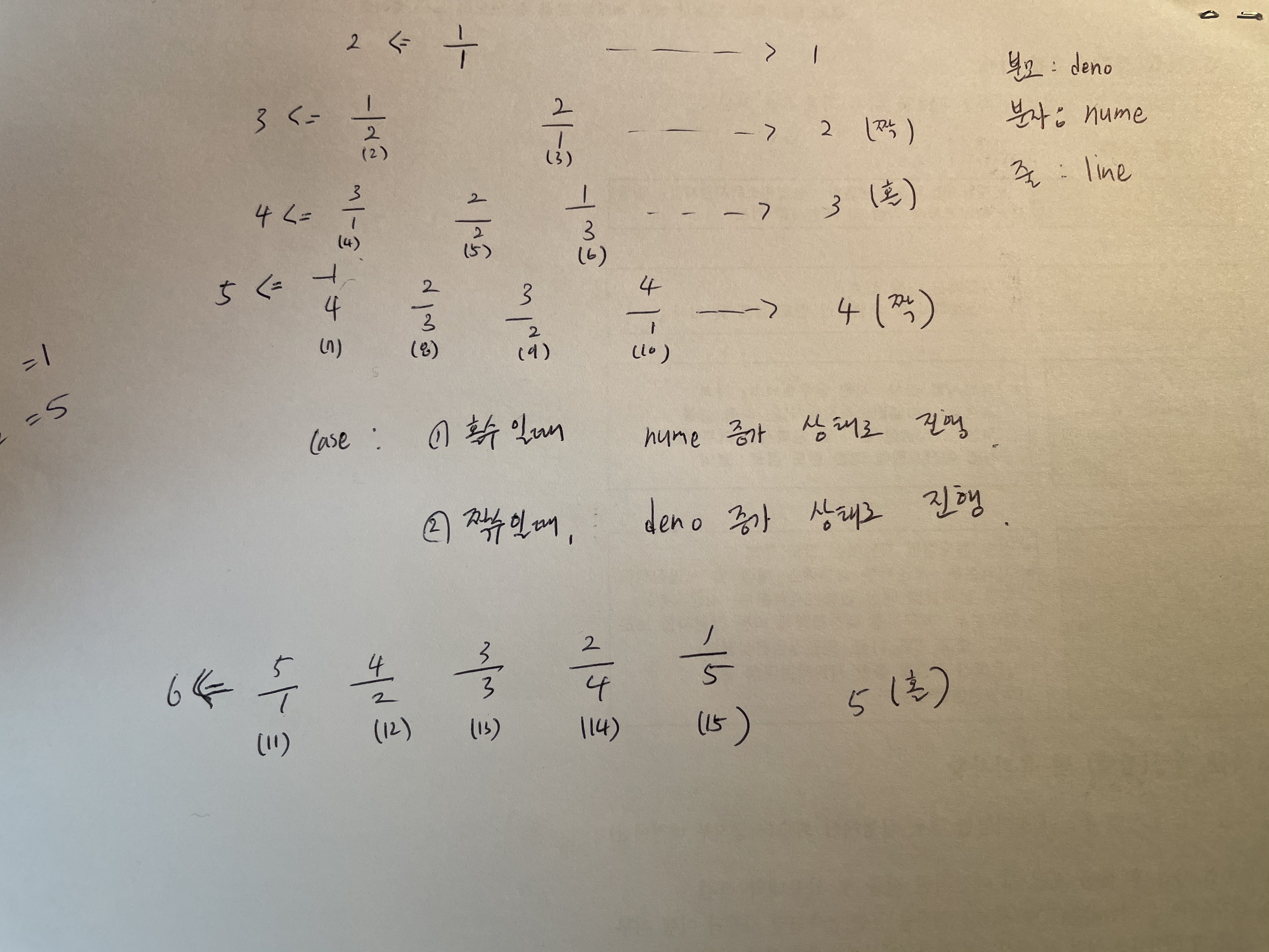 - 위의 성질을 이용하여 for문을 통한 탐색이 아닌 사칙연산으로 원하는 분수를 구할 수 있습니다.