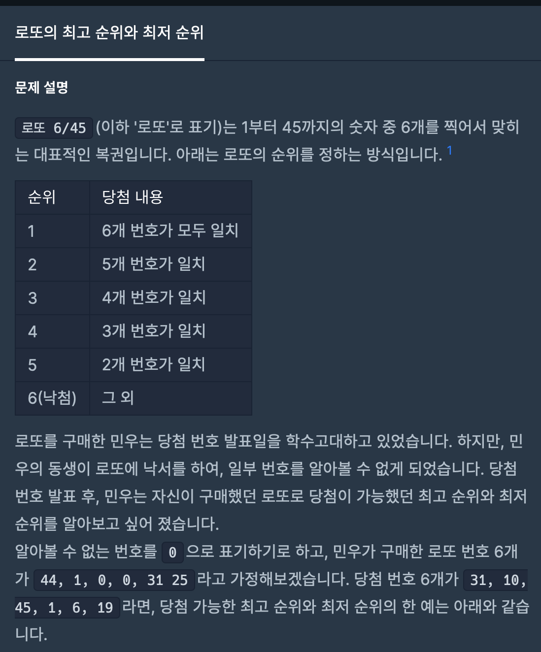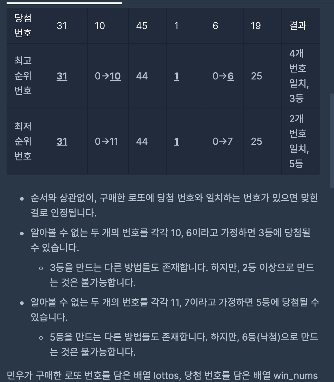 #include <string> #include <vector> using namespace std; vector<int> solution(vector<int> lottos, vector<int> win_nums) { vector<int> answer; int Win[7] = {6,6,5,4,3,2,1}; int cntZero=0; int cntMin=0; for(int i=0; i< 6; i++) { if(lottos[i] == 0) //알 수 없는 번호 { cntZero++; } else { for(int j=0; j<6; j++) { if(lottos[i] == win_nums[j]) { cntMin++; } } } } answer.push_back(Win[cntMin+cntZero]); answer.push_back(Win[cntMin]); return answer; }=> 주어진 배열에 win_nums 숫자가 몇 개 일치하는지 확인하여 cntMin에 넣습니다.