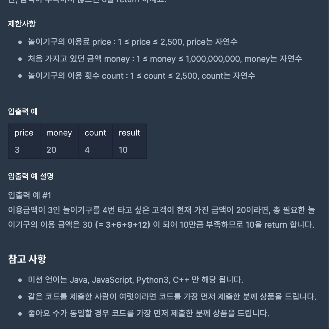 제한사항 및 입출력 예 using namespace std; long long solution(int price, int money, int count) { long long answer = 0; for(int i=1; i<=count; i++) // 3 6 9 12 -- 30 { answer += price *i; } answer -= money; if( answer > 0) { answer = answer; } else { answer =0; } return answer; }=> 주어진 조건대로 문제를 해결하면 되는 문제입니다.