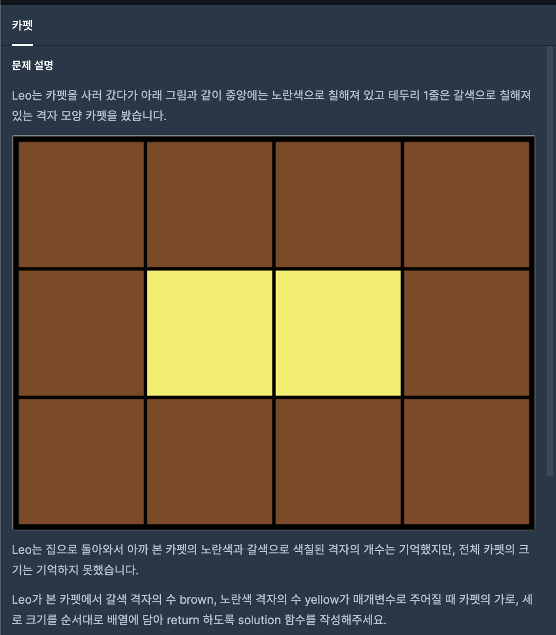 10 2 [4, 3] 8 1 [3, 3] 24 24 [8, 6] #include <string> #include <vector> using namespace std; vector<int> solution(int brown, int yellow) { vector<int> answer; int area = brown + yellow; for(int width =1; width <= area/2; width++ ) { for(int height =1; height <= width; height++) { int mul = width*height; if(mul == area) { if( (width-2)*(height-2) ==yellow ) { answer.push_back(width); answer.push_back(height); break; } else continue; } } if(!answer.empty()) break; } return answer; }=> 문제에 주어진대로 풀면 되는 문제입니다. (완전탐색)