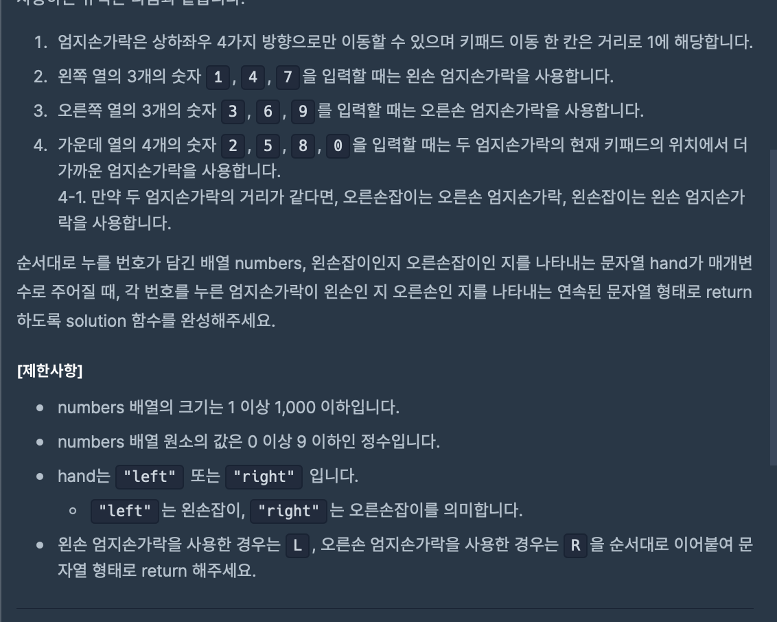 => 2차원배열을 이용해 왼손과 오른손 중 가까이 갈 수 있는 손을 체크하였습니다.