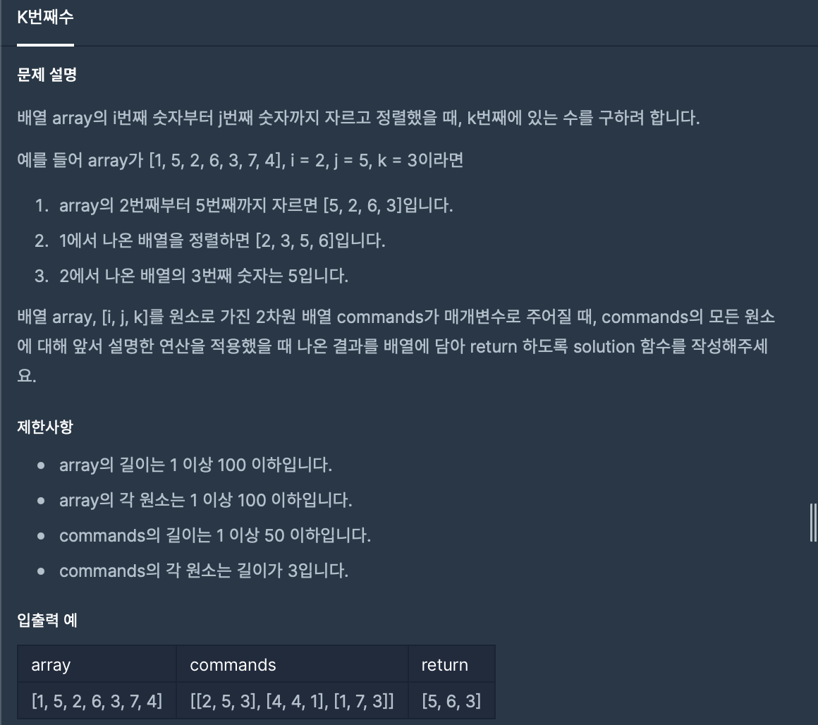 [1, 5, 2, 6, 3, 7, 4]를 1번째부터 7번째까지 자릅니다. [1, 2, 3, 4, 5, 6, 7]의 세 번째 숫자는 3입니다.#include <string> #include <vector> #include <algorithm> #include <iostream> using namespace std; vector<int> solution(vector<int> array, vector<vector<int>> commands) { vector<int> answer; int comLimit = commands.size(); for(int i=0; i<comLimit; i++) { vector<int> tmp; for(int j=commands[i][0]; j<=commands[i][1]; j++) { tmp.push_back(array[j-1]); } sort(tmp.begin(),tmp.end()); int pushIndex = commands[i][2]-1; answer.push_back(tmp[pushIndex]); tmp.clear(); } return answer; }=> 각 배열에 첫 번째, 두 번째, 세 번째 원소를 사용해 원하는 만큼 자르고 K번째에 있는 수를 찾는 문제였습니다.
