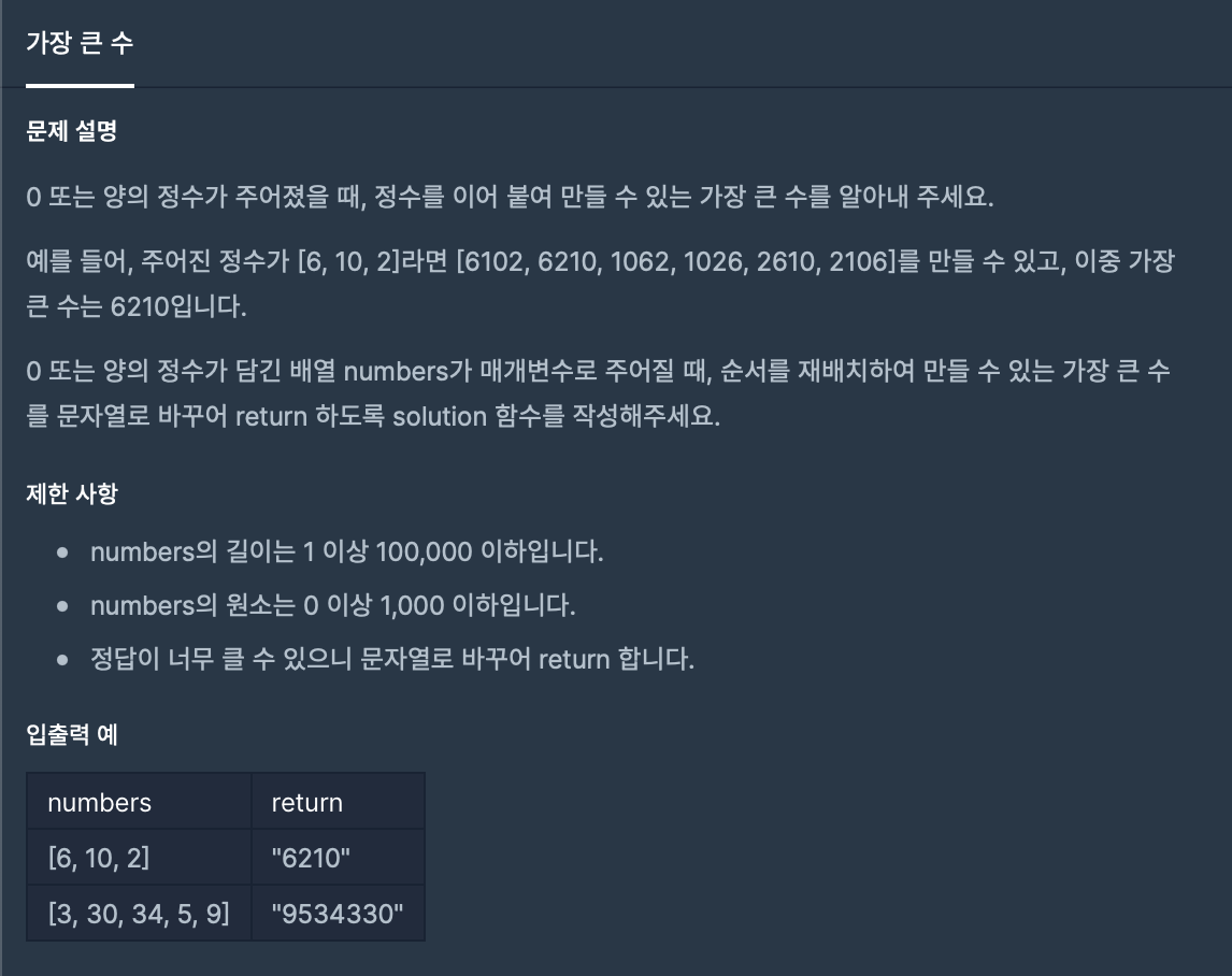가장 큰 수프로그래머스(Programmers) 2021. 11. 26. 21:43반응형