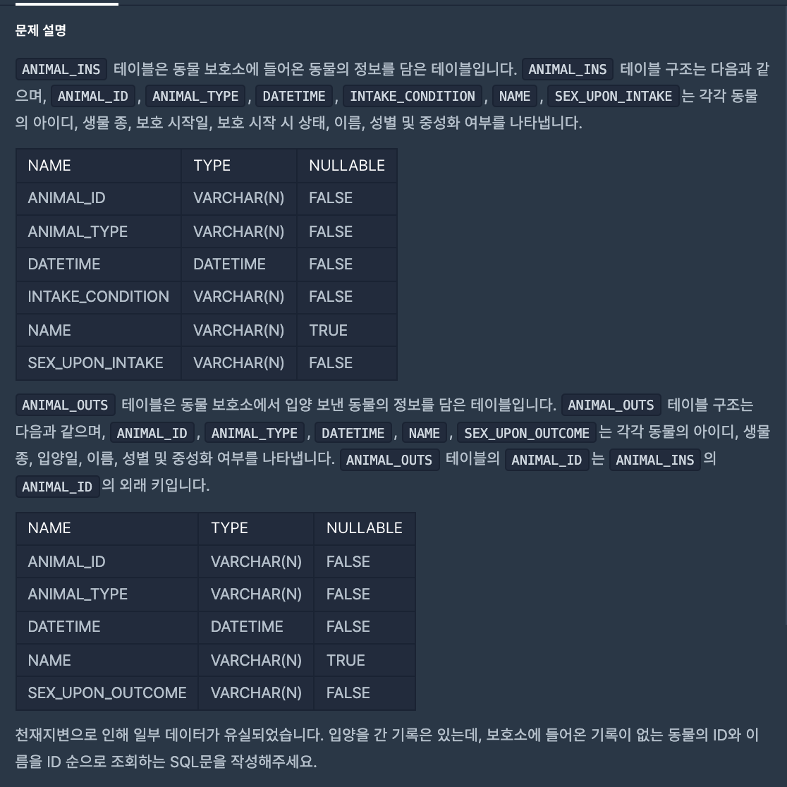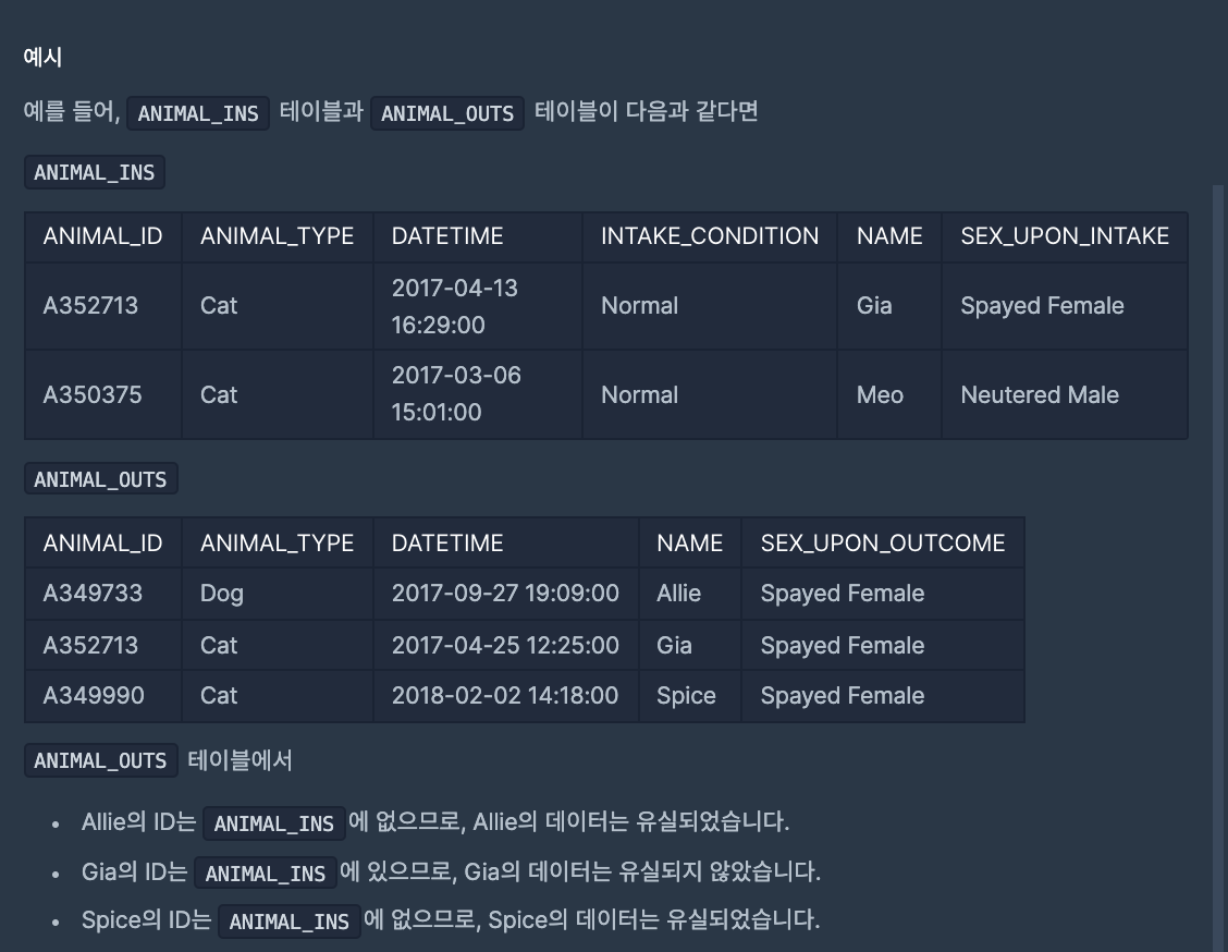 A349733 Allie A349990 Spice SELECT B.ANIMAL_ID, B.NAME FROM ANIMAL_INS A, ANIMAL_OUTS B WHERE 1=1 AND A.ANIMAL_ID (+)=B.ANIMAL_ID AND A.ANIMAL_ID IS NULL ORDER BY B.ANIMAL_ID;=> OUTER JOIN을 이용하여 문제를 해결하였습니다.