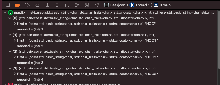 #include <string> #include <vector> #include <map> using namespace std; int main() { map<string, int> mapEx; // string형도 KEY값이 가능 mapEx.insert(make_pair("HOO3", 4)); mapEx.insert(make_pair("HOO", 1)); mapEx.insert(make_pair("HOO1", 2)); mapEx.insert(make_pair("HOO2", 3)); mapEx["HOO4"]=4; // 해당 방법으로도 삽입가능. return 0; }