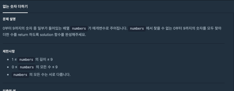 - 1, 2, 3이 numbers에 없으므로, 1 + 2 + 3 = 6을 return 해야 합니다.
