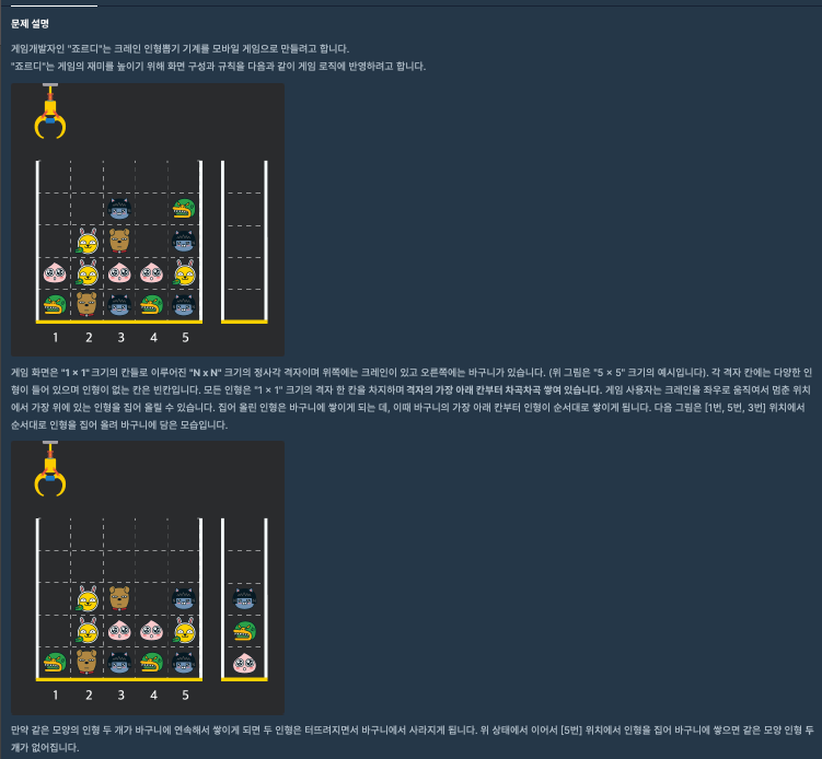 - moves 배열 각 원소들의 값은 1 이상이며 board 배열의 가로 크기 이하인 자연수입니다.