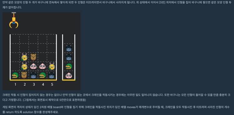 => moves의 index를 탐색하며 해당 값에 해당하는 board에 0이 아닌 값을 찾는 것을 찾아야합니다.