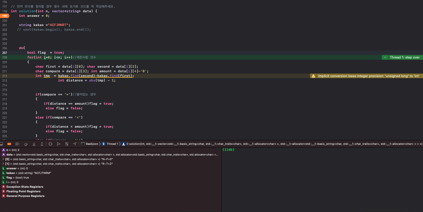 #include <string> #include <vector> #include <algorithm> #include <iostream> using namespace std; // 전역 변수를 정의할 경우 함수 내에 초기화 코드를 꼭 작성해주세요. int solution(int n, vector<string> data) { int answer = 0; string kakao ="ACFJMNRT"; do{ bool flag = true; for(int i=0; i<n; i++)//제한사항 갯수 { char first = data[i][0]; char second = data[i][2]; char compare = data[i][3]; int amount = data[i][4]-'0'; int tmp = kakao.find(second)-kakao.find(first); int distance = abs(tmp) - 1; if(compare == '=')//붙어있는 경우 { if(distance == amount)flag = true; else flag = false; } else if(compare == '<') { if(distance < amount)flag = true; else flag = false; } else if(compare == '>') { if(distance > amount)flag = true; else flag = false; } if(flag)continue; else { flag = false; break; } } if(flag)answer++; }while(next_permutation(kakao.begin(), kakao.end())); return answer; }=> 사진을 찍을 수 있는 경우의 수는 '순열'의 개수입니다.