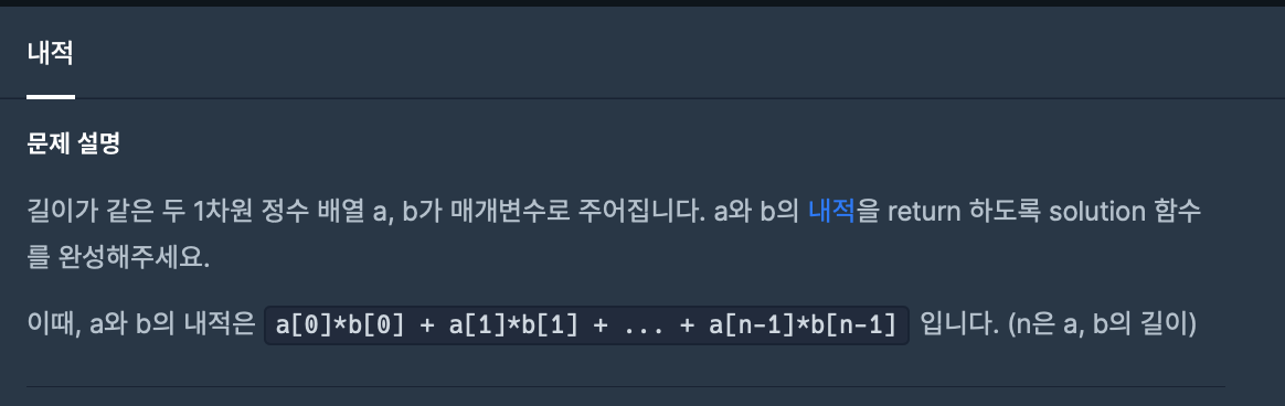 입출력 예 #1- a와 b의 내적은 1*(-3) + 2*(-1) + 3*0 + 4*2 = 3 입니다.