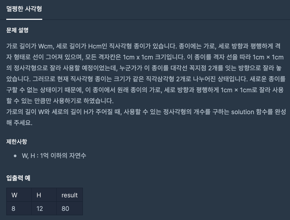 가로가 8, 세로가 12인 직사각형을 대각선 방향으로 자르면 총 16개 정사각형을 사용할 수 없게 됩니다. 원래 직사각형에서는 96개의 정사각형을 만들 수 있었으므로, 96 - 16 = 80 을 반환합니다.