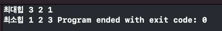 int main() { priority_queue<int, vector<int>, less<int>> maxpq; //max Heap priority_queue<int, vector<int>, greater<int>> minpq; //min Heap maxpq.push(1);maxpq.push(2);maxpq.push(3); minpq.push(1);minpq.push(2);minpq.push(3); cout << "최대힙 "; while(!maxpq.empty()) { cout << maxpq.top() <<" "; maxpq.pop(); } cout << '\n'<<"최소힙 "; while(!minpq.empty()) { cout << minpq.top() <<" "; minpq.pop(); } return 0; }