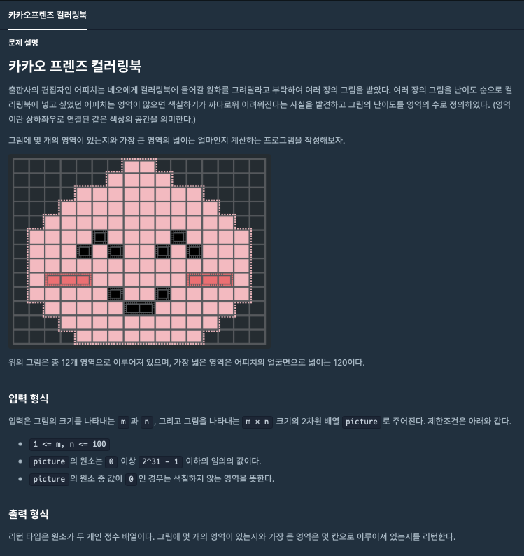 #include <vector> #include <iostream> #include <algorithm> #include <cstring> using namespace std; int arr[101][101]; int UpDownLeftRight [4][2] ={{1,0},{-1,0},{0,1},{0,-1} }; vector<vector<int>> pic; int M,N; int dfs(int x,int y, int cnt )//x는 행 Y는 열 { arr[x][y]=true; for(int i=0; i<4;i++) { int nextX = x + UpDownLeftRight[i][0]; int nextY = y + UpDownLeftRight[i][1]; if(nextX<0||nextX>=M|nextY<0||nextY>=N) continue; if(pic[x][y]==pic[nextX][nextY] && arr[nextX][nextY]==false) { cnt = dfs(nextX, nextY, cnt+1); } } return cnt; } // 전역 변수를 정의할 경우 함수 내에 초기화 코드를 꼭 작성해주세요. vector<int> solution(int m, int n, vector<vector<int>> picture) { int number_of_area = 0; int max_size_of_one_area = 0; pic = picture; M=m;N=n; memset(arr,0,sizeof(arr)); for(int i=0; i<m; i++) { for(int j=0; j<n; j++) { if(!arr[i][j] && picture[i][j] !=0) { number_of_area++; max_size_of_one_area = max(max_size_of_one_area,dfs(i,j,1)); } } } vector<int> answer(2); answer[0] = number_of_area; answer[1] = max_size_of_one_area; return answer; }=> DFS나 BFS를 사용하여 풀어야 하는 문제였습니다.