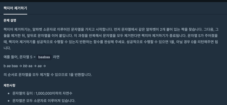 문자열이 남아있지만 짝지어 제거할 수 있는 문자열이 더 이상 존재하지 않기 때문에 0을 반환합니다.#include <iostream> #include <string> #include <stack> using namespace std; int solution(string s) { int answer = 0; stack<char> st; for(int i=0; i<s.size(); i++) { if(st.empty() || st.top() != s[i]) { st.push(s[i]); } else if(st.top() == s[i]) st.pop(); } if(st.empty()) answer=1; return answer; }=> 효율성과 정확성을 위해 stack을 사용하면 간단한 문제였습니다.