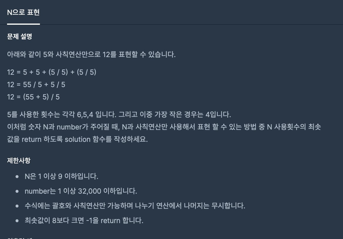 11 = 22 / 2와 같이 2를 3번만 사용하여 표현할 수 있습니다.#include <string> #include <vector> #include <cmath> #include <unordered_set> // unorderd_set사용 using namespace std; int get_basic(int N, int cnt) { int res = 0; while (cnt > 0) { cnt -= 1; res += N * pow(10, cnt); } return res; } int solution(int N, int number) { int answer = -1; vector<unordered_set<int>> s(8); int idx=1; if(N == number) { return 1; } for(auto &x : s) { x.insert(get_basic(N,idx)); idx ++; } for (int i=1; i<8; i++) { for (int j=0; j<i; j++) { for (const auto & op1 : s[j]) { for (const auto & op2 : s[i-j-1]) { s[i].insert(op1+op2); s[i].insert(op1-op2); s[i].insert(op1*op2); if (op2 != 0) s[i].insert(op1/op2); } } } if (s[i].find(number) != s[i].end()) { answer = i+1; break; } } return answer; }=> DP를 사용하여 풀어야하는 문제입니다.