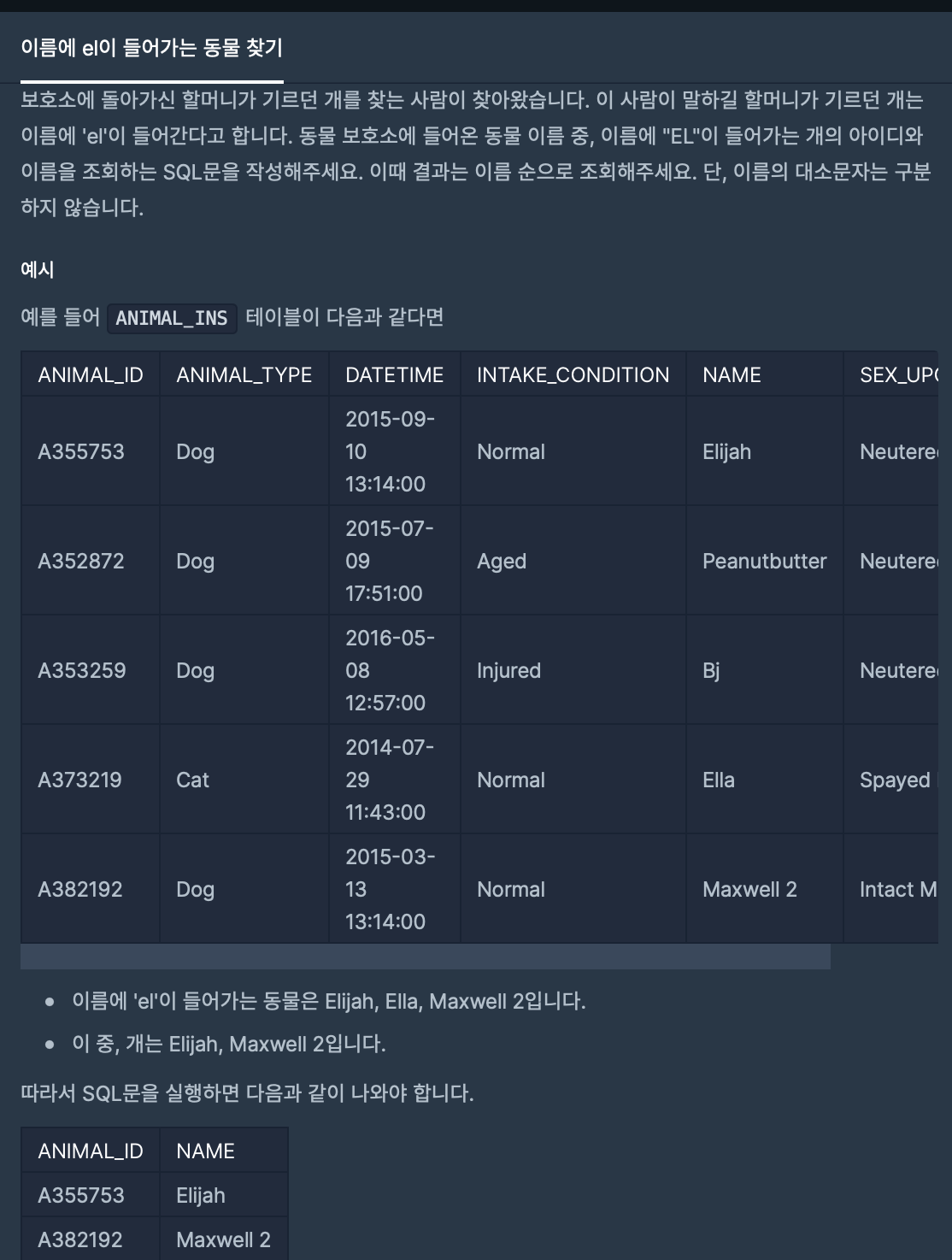 A355753 Dog 2015-09-10 13:14:00 Normal Elijah Neutered Male A352872 Dog 2015-07-09 17:51:00 Aged Peanutbutter Neutered Male A353259 Dog 2016-05-08 12:57:00 Injured Bj Neutered Male A373219 Cat 2014-07-29 11:43:00 Normal Ella Spayed Female A382192 Dog 2015-03-13 13:14:00 Normal Maxwell 2 Intact Male - 이름에 'el'이 들어가는 동물은 Elijah, Ella, Maxwell 2입니다.