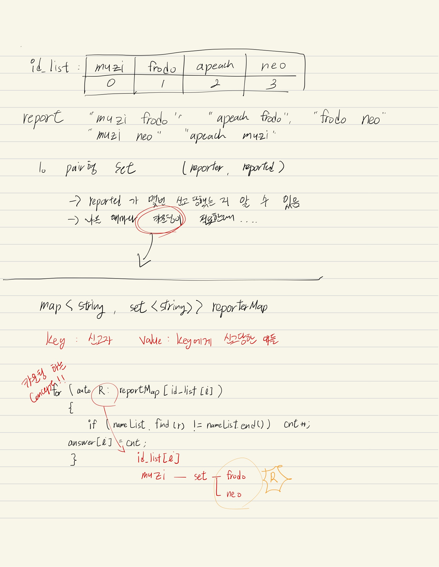 문제 설명 #include <string> #include <vector> #include <iostream> #include <map> #include <set> using namespace std; vector<int> solution(vector<string> id_list, vector<string> report, int k) { vector<int> answer(id_list.size()); map<string, set<string>> reportMap; //key : 신고한 사람, value : key값에게 신고당한 아이들 map<string , int> reportCnt; // 신고당한 사람, 횟수 for (string s: report) { string tmp;//key와 value 들어갈 string string reporter; for(char ch : s) { if(ch == ' ') { reporter=tmp; tmp=""; continue; } tmp += ch; } if(reportMap[reporter].count(tmp)) { continue; } reportMap[reporter].insert(tmp); reportCnt[tmp]++; } set<string> nameList;//k번 이상 신고당한 이름 for(string s : id_list ) { if(reportCnt[s] >= k) { nameList.insert(s); } } for (int i = 0; i < id_list.size(); i++) { int cnt = 0; for (auto r : reportMap[id_list[i]]) { if (nameList.find(r) != nameList.end()) { cnt++; } } answer[i] = cnt; } return answer; }=> SET과 MAP을 적절히 활용하여 풀어야 하는 문제였습니다.
