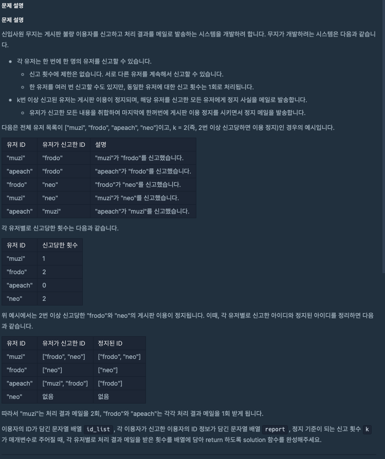 문제 링크입니다: https://programmers.co.kr/learn/courses/30/lessons/92334 코딩테스트 연습 - 신고 결과 받기 문제 설명 신입사원 무지는 게시판 불량 이용자를 신고하고 처리 결과를 메일로 발송하는 시스템