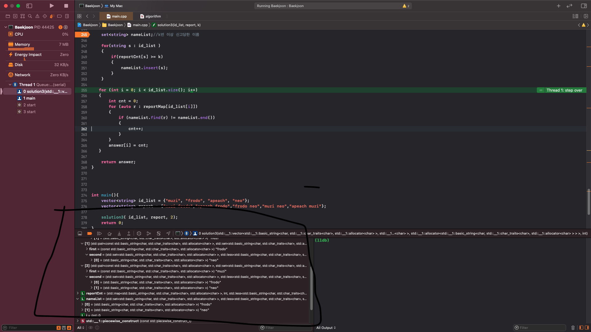 문제 설명 #include <string> #include <vector> #include <iostream> #include <map> #include <set> using namespace std; vector<int> solution(vector<string> id_list, vector<string> report, int k) { vector<int> answer(id_list.size()); map<string, set<string>> reportMap; //key : 신고한 사람, value : key값에게 신고당한 아이들 map<string , int> reportCnt; // 신고당한 사람, 횟수 for (string s: report) { string tmp;//key와 value 들어갈 string string reporter; for(char ch : s) { if(ch == ' ') { reporter=tmp; tmp=""; continue; } tmp += ch; } if(reportMap[reporter].count(tmp)) { continue; } reportMap[reporter].insert(tmp); reportCnt[tmp]++; } set<string> nameList;//k번 이상 신고당한 이름 for(string s : id_list ) { if(reportCnt[s] >= k) { nameList.insert(s); } } for (int i = 0; i < id_list.size(); i++) { int cnt = 0; for (auto r : reportMap[id_list[i]]) { if (nameList.find(r) != nameList.end()) { cnt++; } } answer[i] = cnt; } return answer; }=> SET과 MAP을 적절히 활용하여 풀어야 하는 문제였습니다.