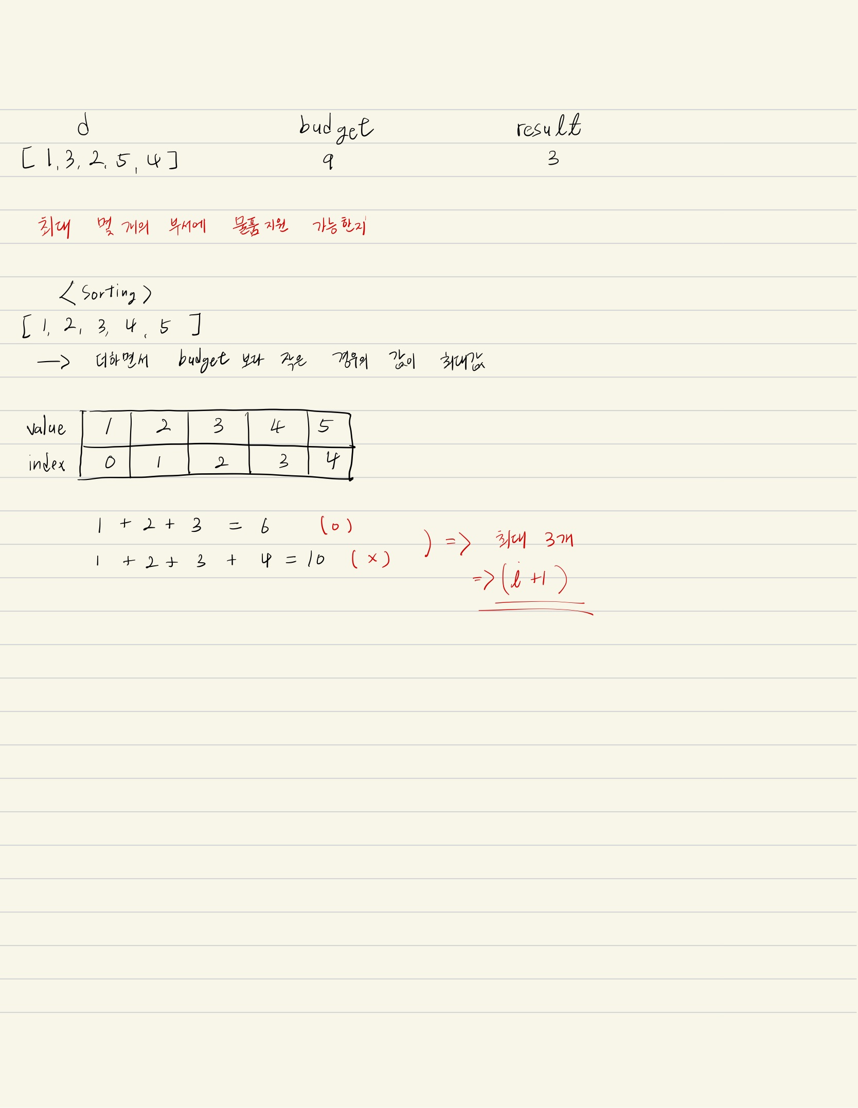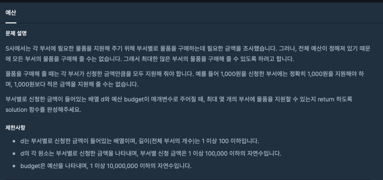 모든 부서의 물품을 구매해주면 10원이 됩니다. 따라서 최대 4개 부서의 물품을 구매해 줄 수 있습니다.#include <iostream> #include <stdio.h> #include <string> #include <vector> #include <algorithm> using namespace std; int solution(vector<int> d, int budget) { int answer = 0; int departPay=0;//부서가 사용한 금액 총합 sort(d.begin(), d.end(),less()); for(int i=0; i<d.size(); i++) { departPay += d[i]; if(departPay > budget)//예산초과 { answer =i; break; } answer =i+1; } return answer; }
