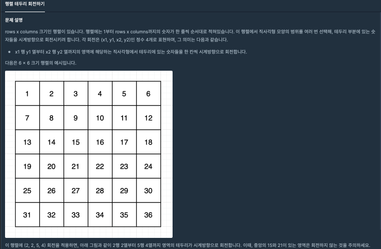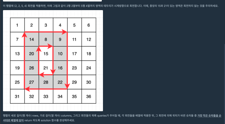 - x1 행 y1 열부터 x2 행 y2 열까지 영역의 테두리를 시계방향으로 회전한다는 뜻입니다.