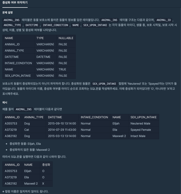 문제 설명 -- 코드를 입력하세요 SELECT ANIMAL_ID, NAME, CASE WHEN SEX_UPON_INTAKE like '%Neutered%' then 'O' WHEN SEX_UPON_INTAKE like '%Spayed%' then 'O' else 'X' end as 중성화 FROM ANIMAL_INS ;=> ORACLE의 CASE WHEN 구문을 쓸 줄 아는지 묻는 문제였습니다.